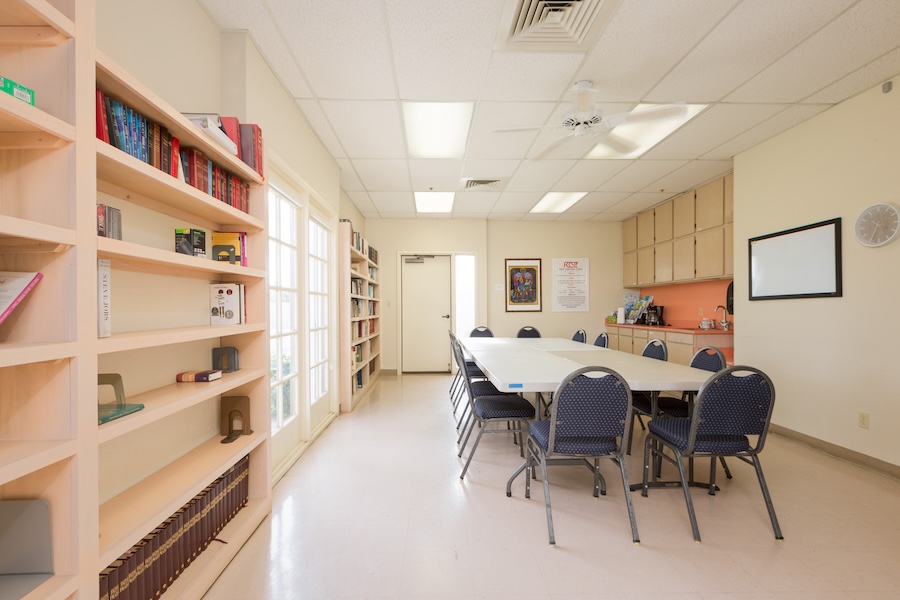 The library comfortably holds 13 as meeting space. The room has a sink and counter and in close proximity to restroom.